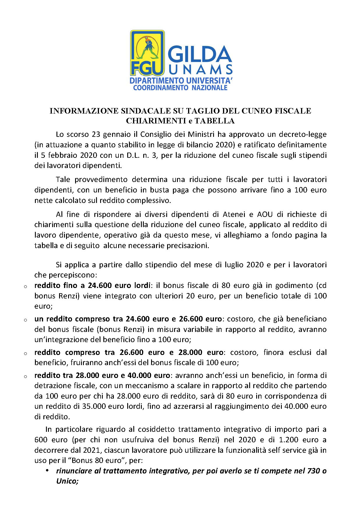 Comunicati Segreteria Nazionale Redazione 31 Luglio 2020 0 Commenti COMUNICATO SINDACALE SU TAGLIO DEL CUNEO FISCALE – CHIARIMENTI e TABELLA