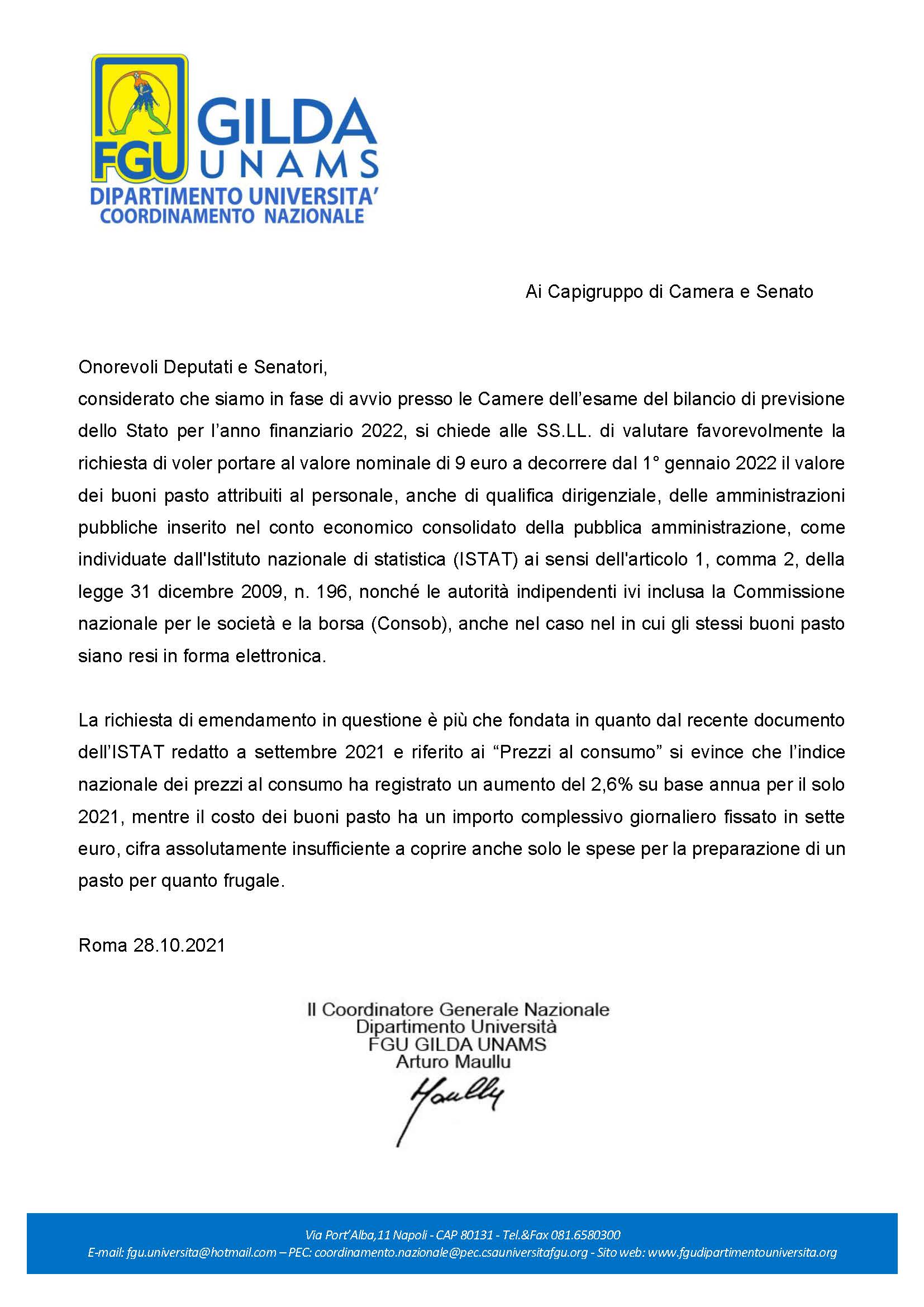 Quì di seguito la nota inviata ai Capi Gruppo Parlamentari di Camera e Senato riguardante la richiesta di valutare favorevolmente a voler portare al valore nominale di 9 euro a decorrere dal 1° gennaio 2022 il valore dei buoni pasto attribuiti al personale, anche di qualifica dirigenziale, delle amministrazioni pubbliche inserito nel conto economico consolidato della pubblica amministrazione.