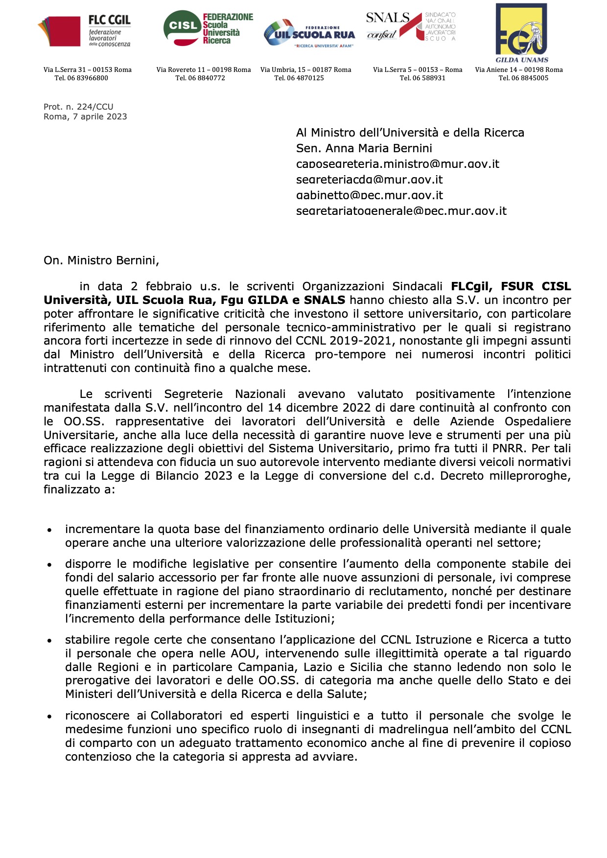 7 Aprile 2023 Comunicati Segreteria Nazionale COMUNICATO SINDACALE UNITARIO DEL 7 APRILE 2023 – LETTERA INVIATA AL MINISTRO BERNINI MUR