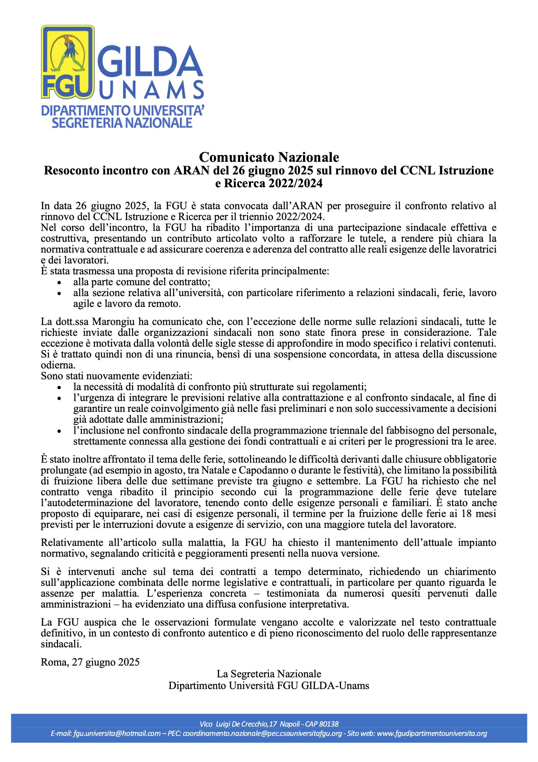 Comunicato – Resoconto incontro con ARAN del 26 giugno 2025 sul rinnovo del CCNL Istruzione e Ricerca 2022/2024