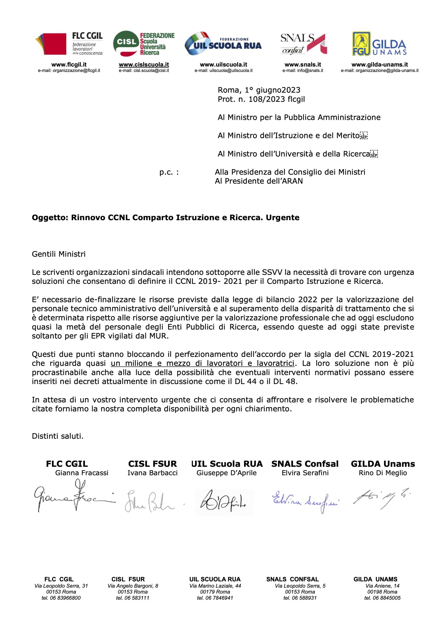 LETTERA UNITARIA ALLE ISTITUZIONI – RINNOVO CCNL 2019/2021 COMPARTO ISTRUZIONE E RICERCA